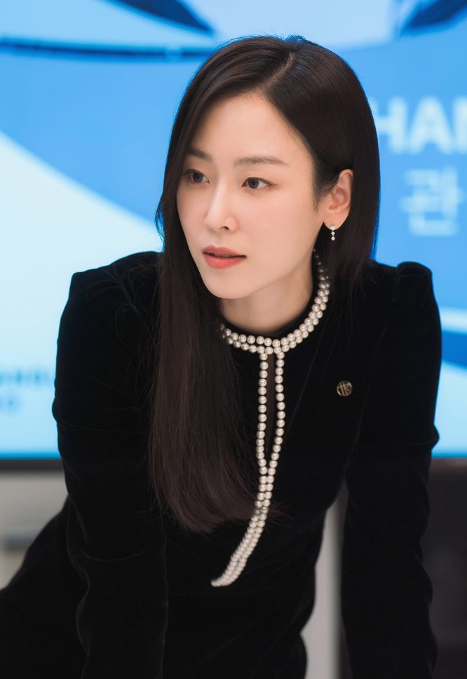 鋭く知的なまなざし、洗練されたメイク、そして隙のないスーツスタイル——すべてが「勝ち続ける女弁護士」としてのスジェの強さを体現しています。